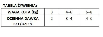 ÉNERGIE MÉTABOLIQUE : 810 kcal/kg. INSTRUCTIONS POUR L’ALIMENTATION : L’apport journalier recommandé est indiqué dans le tableau d’alimentation mais peut varier en fonction de l’âge du chat, de son activité et de l’environnement dans lequel il vit.Veillez toujours à ce que votre chat ait accès à de l’eau fraîche. Nourrissez-le à température ambiante. Si vous donnez à votre chat des aliments variés et savoureux, n’oubliez pas de réduire la dose recommandée du repas quotidien habituel de votre chat. Après ouverture, conserver au réfrigérateur. Date de péremption : 24 mois.