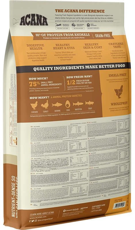 Les chats ont besoin d’un régime riche en protéines animales. Ce besoin est déterminé par leur constitution physiologique et leur nature carnivore. Inspiré par les vastes prairies canadiennes et les lacs vierges, ACANA Wild Prairie offre à votre chat des ingrédients d’origine animale de haute qualité, comme du poulet et de la dinde élevés en liberté, du poisson d’eau douce et des œufs d’élevage en grange. Par conséquent, ACANA est riche en protéines et en nutriments provenant de la viande musculaire, des organes internes et des cartilages et os présents dans les proportions WholePrey de notre alimentation. Ainsi, votre chat reçoit tout ce dont il a besoin pour être en pleine santé.