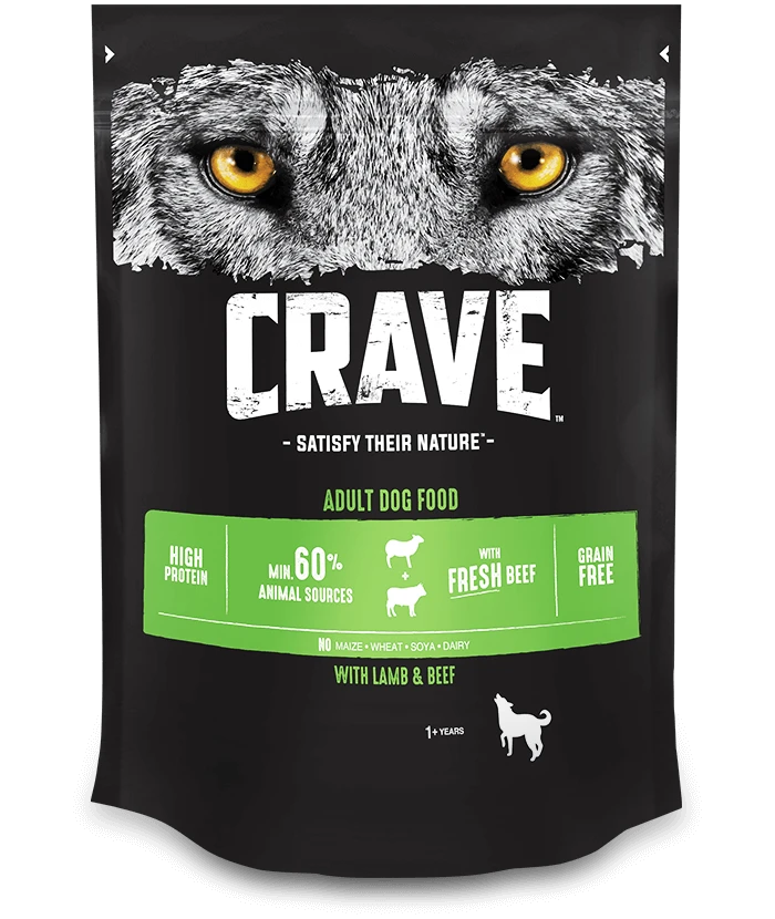 La composition de Crave Adult (agneau et bœuf) a été élaborée sur la base de l’alimentation naturelle et des besoins des chiens de plus d’un an, de races moyennes et grandes. Avec une teneur élevée en ingrédients d’origine animale (min. 60 %) et une grande quantité de protéines (35 %) d’origine animale et végétale, les aliments Crave correspondent aux habitudes alimentaires naturelles de votre animal et de ses ancêtres. En donnant Crave à votre chien, vous lui offrez un repas de haute qualité, nutritif et savoureux, sans ingrédients inutiles et difficiles à digérer. Crave ne contient pas de céréales telles que le blé ou le maïs, et le soja et les produits laitiers n’ont pas été utilisés. Pour cette raison, l’aliment convient également aux animaux de compagnie souffrant d’allergies ou d’intolérances. Les protéines fournissent suffisamment d’énergie et contribuent au maintien d’une silhouette mince. La forte teneur en viande, dont 17% de bœuf, garantit une saveur délicieuse et naturelle, ce qui rend l’aliment très acceptable.