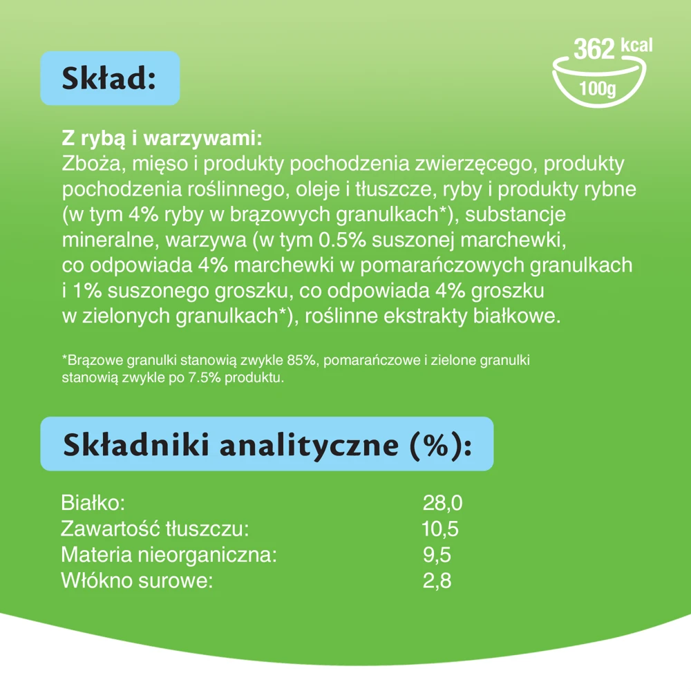 Légumes (y compris 0,5% de carottes séchées (équivalent à 4% de carottes) en granulés orange et 1% de petits pois séchés (équivalent à 4% de petits pois) en granulés verts*)
