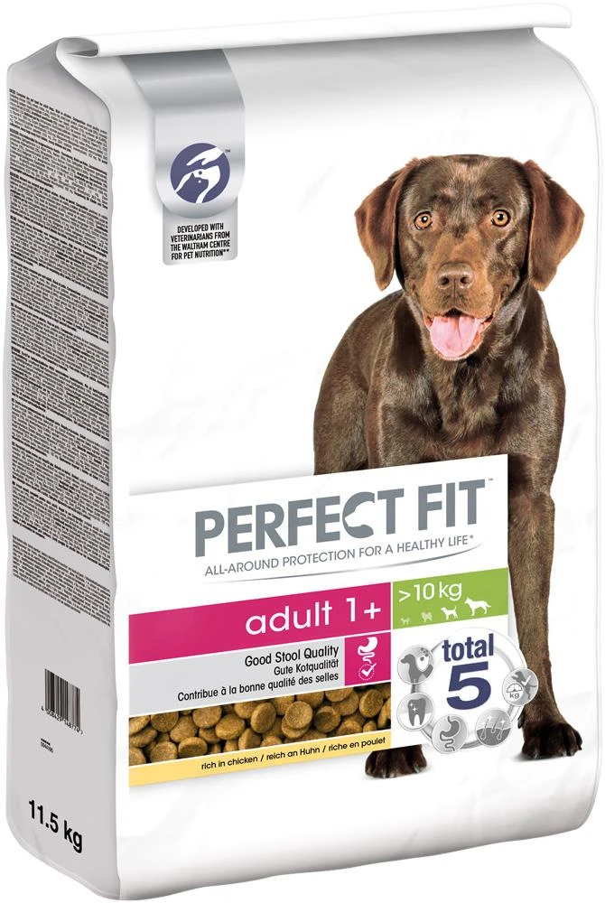 Les aliments secs pour chiens Perfect Fit™ Poulet riche sont des aliments complets et savoureux pour votre animal de compagnie de moyenne à grande race. Des vétérinaires et des nutritionnistes du WALTHAM™ Institut of Animal Science ont participé à l’élaboration de la recette de ces aliments pour chiens. Ils ont analysé les problèmes de santé les plus courants chez les chiens et ont pu créer un aliment innovant avec la formule Total5. Il soutient les 5 domaines les plus importants pour la santé de votre chien adulte : un système immunitaire fort, une digestion saine, une peau et un pelage sains, des soins bucco-dentaires et une condition physique et un poids optimaux. Une alimentation appropriée pour votre chien de grande race se traduit par une santé, une activité et un développement mental optimaux pour votre animal. Donnez-lui ce dont il a besoin avec Perfect Fit™ riche en poulet.
