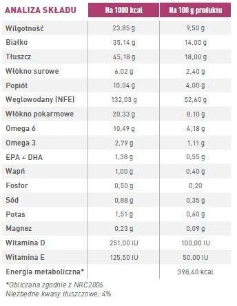 CONSTITUANTS ANALYTIQUES : Protéine : 14,0 % – Teneur en matières grasses : 18,0 % – Cendres brutes : 4,0 % – CelIulose brute : 2,4 % – Calcium :0,4 % – Phosphore : 0,2 % -Potassium : 0,6 % – Sodium : 0,35 % – Acide gras essentiel (acide linoléique) : 4 % – EPA/DHA : 0,55 %.