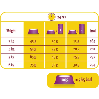 Adaptez les portions à votre chat pour maintenir un poids corporel correct. Répartissez la portion quotidienne sur plusieurs repas. Veillez à ce que votre chat ait accès à de l’eau potable fraîche.
