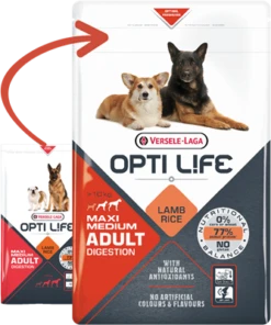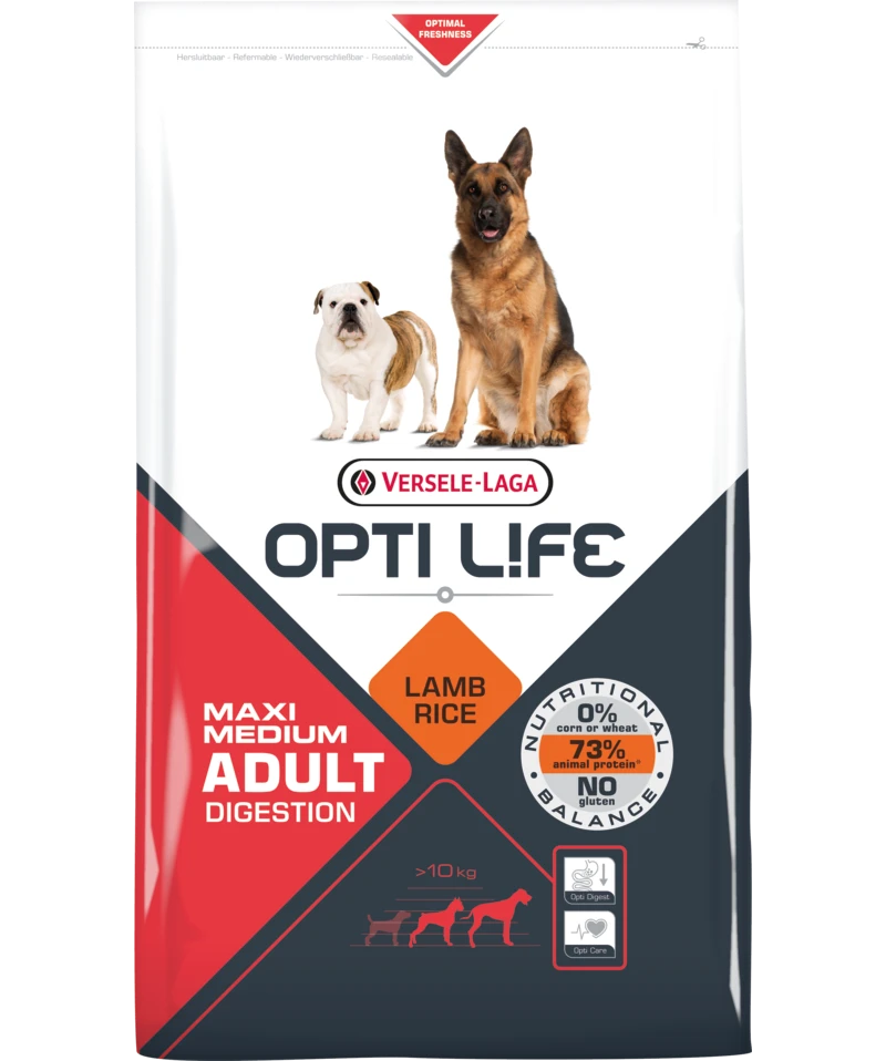 Opti Life Adult Digestion Medium & Maxi est une formule parfaitement Ă©quilibrĂ©e pour les races moyennes et les grandes races Ă base d’agneau et de riz, spĂ©cialement conçue pour votre chien Ă la digestion sensible.